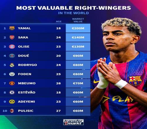 德转列右边锋身价榜:亚马尔2亿欧居首,萨卡第二奥利塞第三