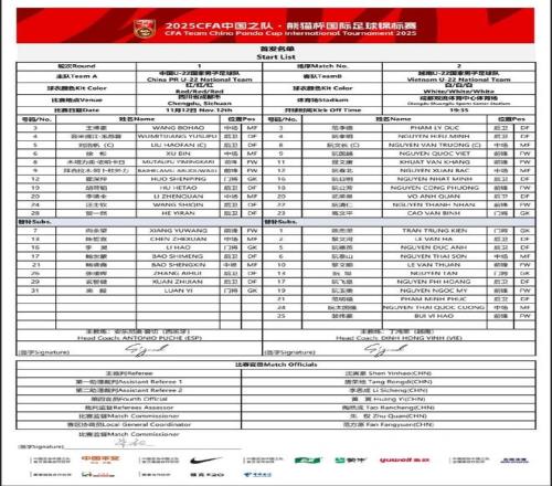 北京时间11月12日19:35,熊猫杯国际邀请赛,中国U22将对阵越南U22,赛前双方公布首发: