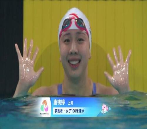 11月12日,上海队唐钱婷摘得全运会女子100米蛙泳金牌,成绩为1分05秒36。11月11日的半决赛中,唐钱婷游出1分06秒3