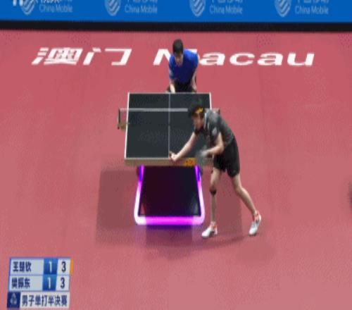 但是王楚钦在发球环节给樊振东极大压力——1比3,王楚钦发了一个台角保护的半出台,樊振东一吊,被早等在位置的王楚钦一个倒地爆冲。