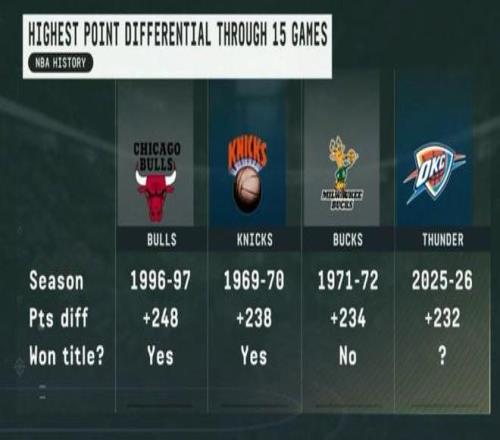 在这份榜单中,本赛季15战14胜的雷霆队以+232分排名历史第四。排在前三的分别是1996-97赛季的公牛(+248)、1969-70赛季的尼克斯(+238)和1971-72赛季的雄鹿(+232)。