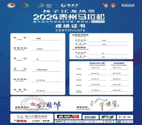 两年后,她在泗洪马拉松上成功破三,以2:58:24完赛。
